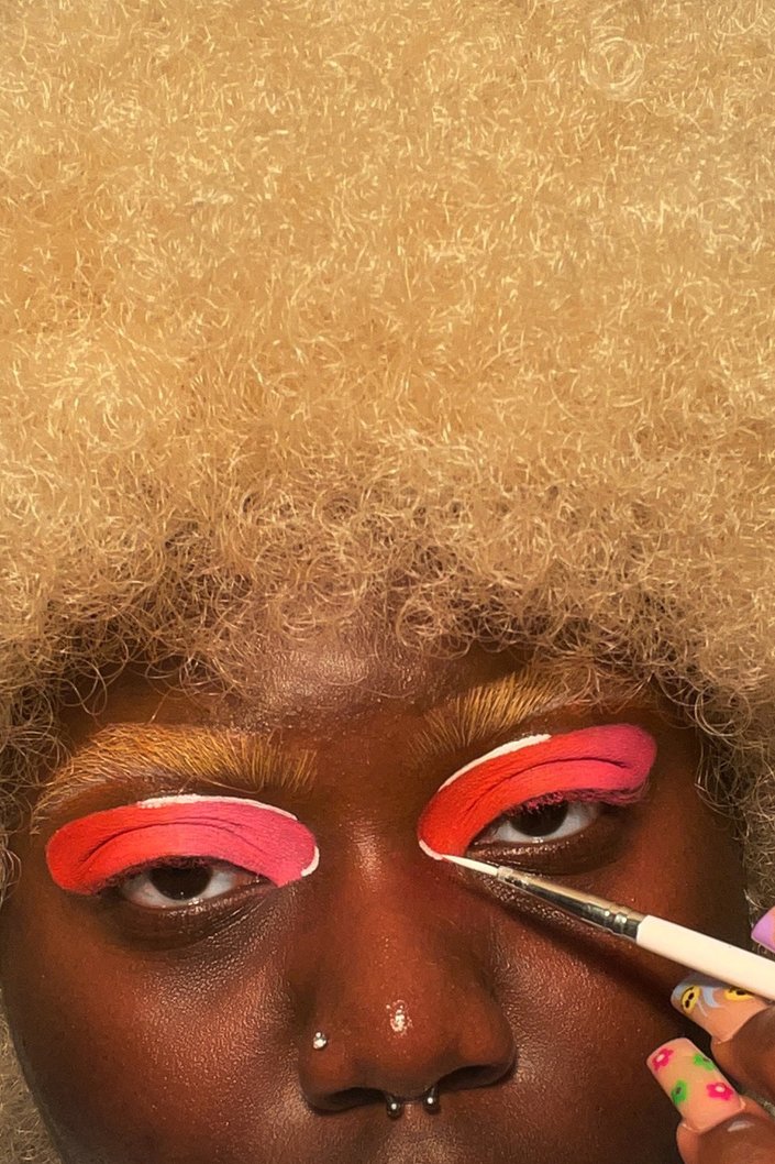 After your oval shape is done, apply Slowburn from the Urban Decay Wired Palette, a bright red shade, on the inner corner and take it to the center of the lid. Then, apply the shade Savage from the same palette, a bright neon pink shade, on the outer corner up to the center of the lid. The key to creating a gradient look is to blend, blend, blend the two colors until there are no harsh lines where they meet.